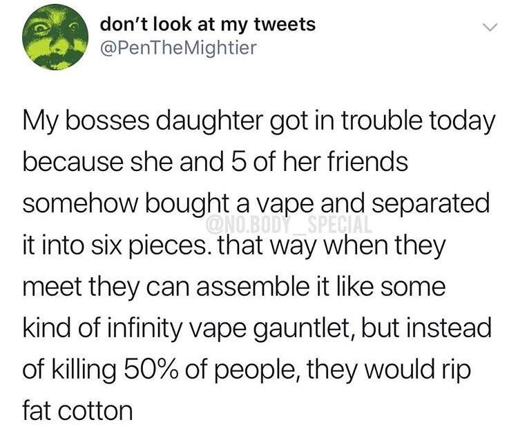arrow-up1269arrow-down1imageInfinity vape gauntlet lemmy.worldickplant@lemmy.world to Lemmy Shitpost@lemmy.world · 4 hours agomessage-square29fedilink