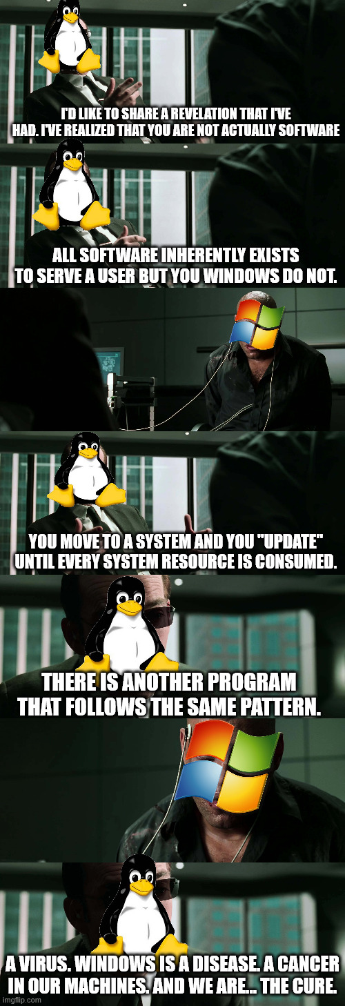 arrow-up1338arrow-down1imageDoes the matrix have you?lemmy.worldessell@lemmy.world to linuxmemes@lemmy.world · 5 hours agomessage-square25fedilink