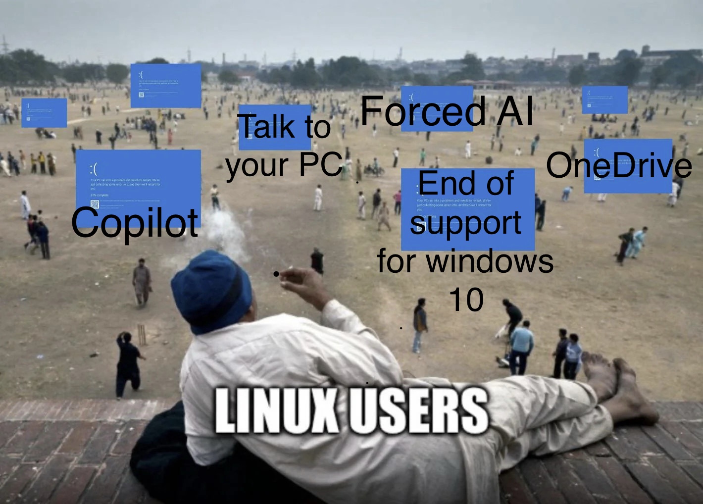arrow-up170arrow-down1imageSo what color is Linux exactly? Is it black like Tux and the terminal? Purple like Debian? Blue like Arch?lemmy.worldRomulusCornflakes@lemmy.worldEnglish · 5 days agomessage-square45fedilink