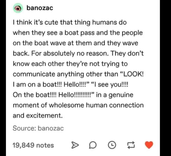 Yeah but your examples are members of the same community. What is weird and endearing is that people who have never been on a boat will wave at people just because they are on a boat. Conversely, people on a boat will eave at people on land. Its as if a transport vehicle was a ride. A jet ski or something.