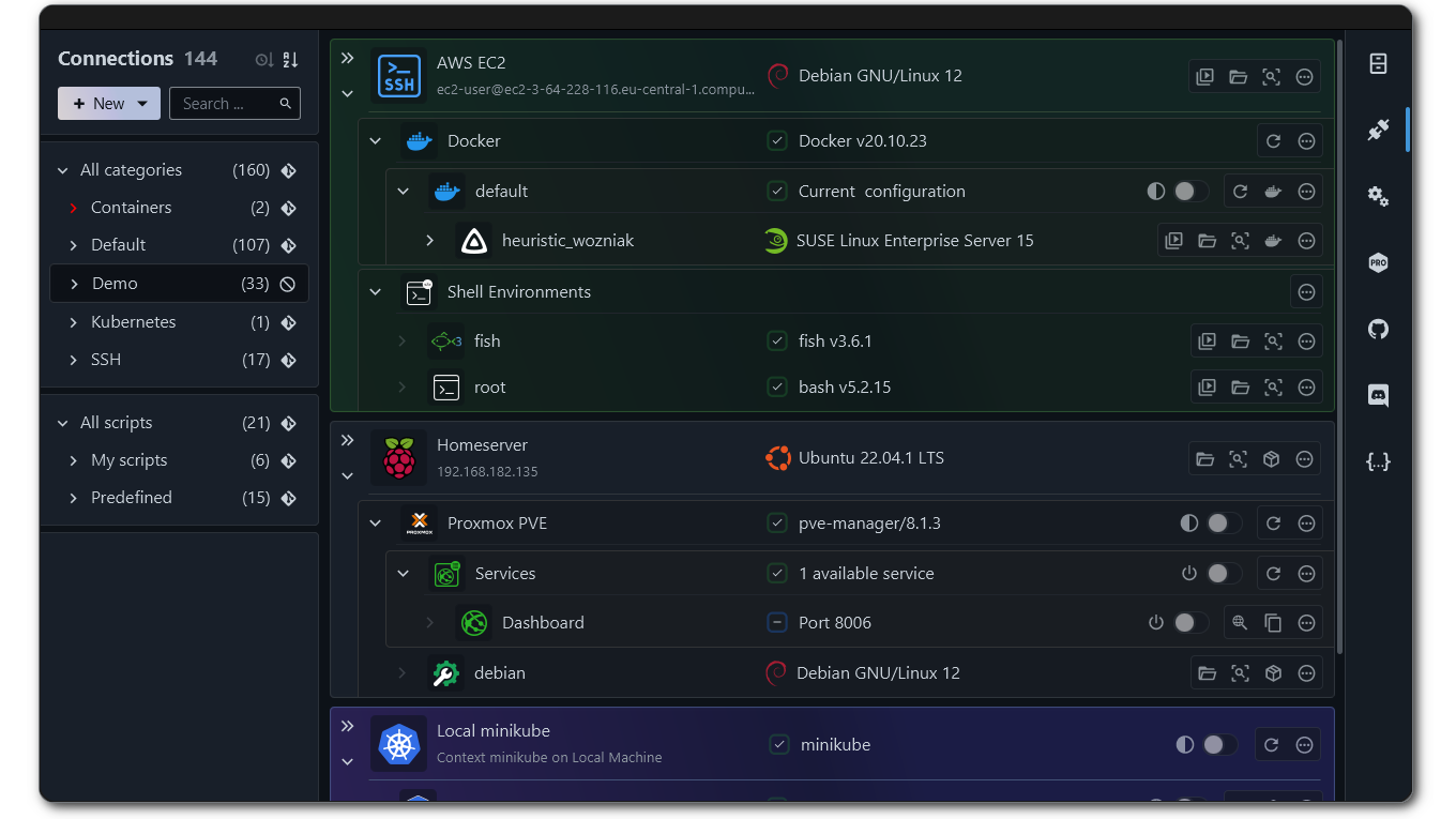 If you haven’t seen it before, XPipe works on top of your installed command-line programs and does not require any setup on your remote systems. It integrates with your tools such as your favourite text/code editors, terminals, shells, command-line tools and more. Here is what it looks like: