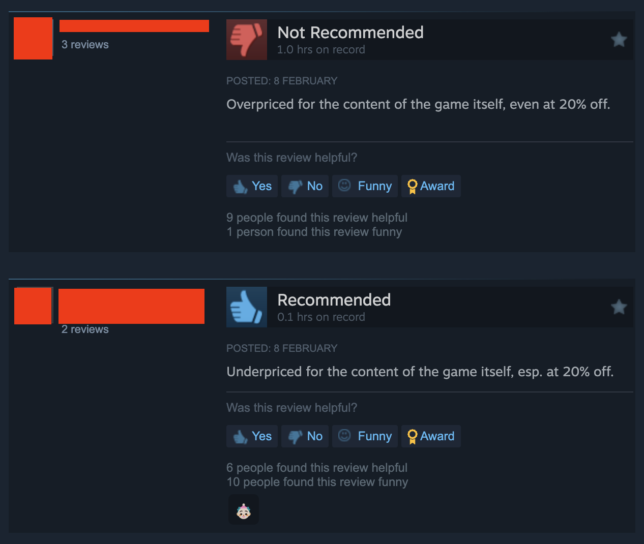 minus-squareLamplighter@lemmy.worldlinkfedilinkarrow-up2·10 months ago1 hour of playtime for 8$ with that sweet 20% off