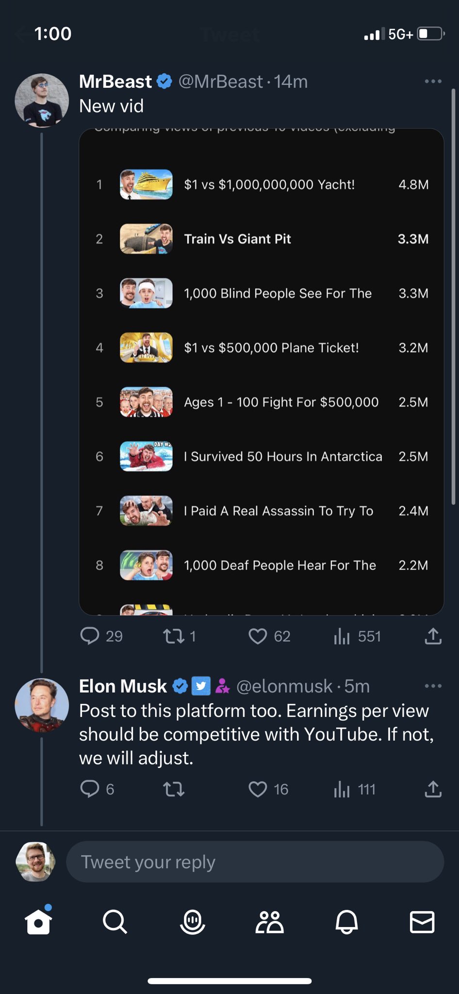 arrow-up15arrow-down1imageElon Musk Urges Mr Beast to Post Videos on Twitter for Equal Earningsi.imgur.commastermind@lemm.ee to Technology@lemmy.worldEnglish · 2 years agomessage-square6fedilink