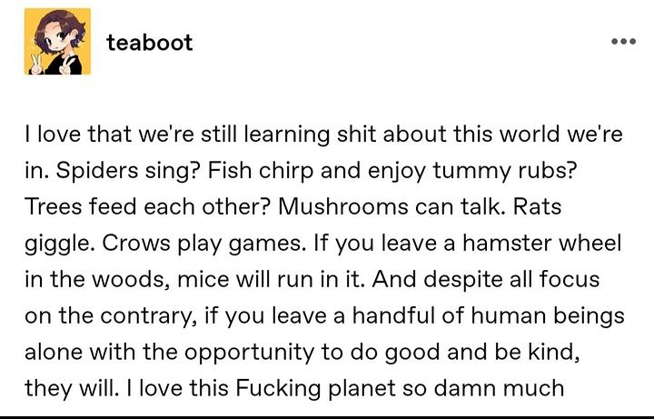 It’s nice to think this way but it’s an oversimplification. The trees are trying to strangle and poison each other The mice will eat each other’s babies etc. Lol
