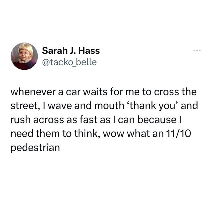 Here’s a fun note, I’m from a place where pedestrian crossings are seen as a mild invitation to slow down, so I tend to wait to see the car fully stopped before I do the magic handwave thing and cross. When I moved to a different country where stopping is seen as mandatory as long as there is anybody waiting to cross I got a TON of angry gestures hurled at me for doing that because drivers thought I was wasting their time by crossing too slowly.
