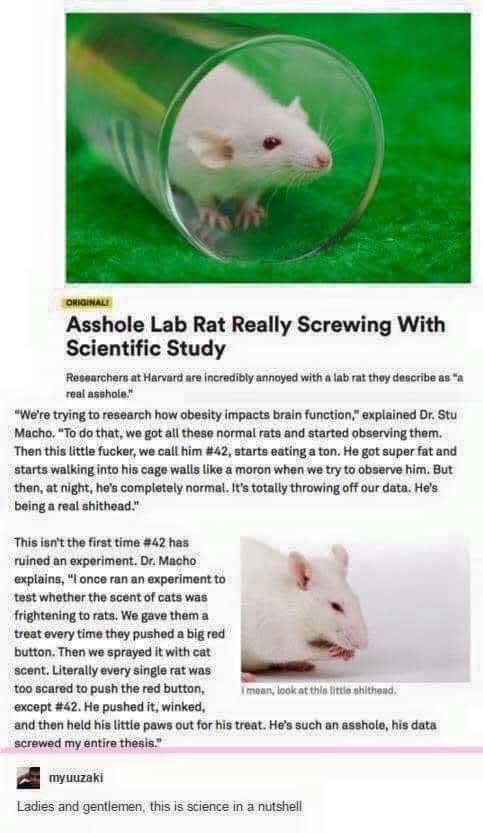 One night, I came into the lab and saw 42 using my computer. Motherfucker knew my password! He had R opened and was manipulating and fabricating data left and right. He saw me, gave a thumbs up, before going back to his cage and lighting up a cigar.