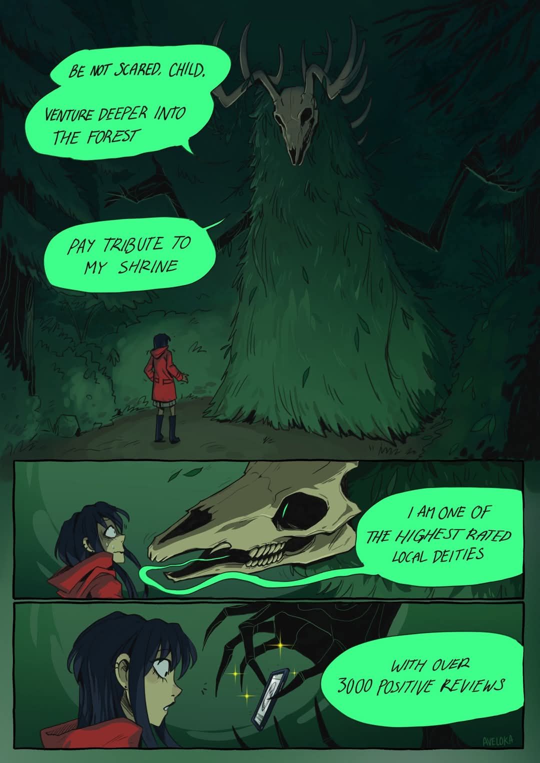 So, forest spirit seeks tribute and those paying tribute review it on their own, sure. Someone eventually brings this up while paying tribute, alright, I’m still with you. But “the spirit of the deep woods has a smart phone with a data plan and the means to keep it charged” is where I start to get real worried.