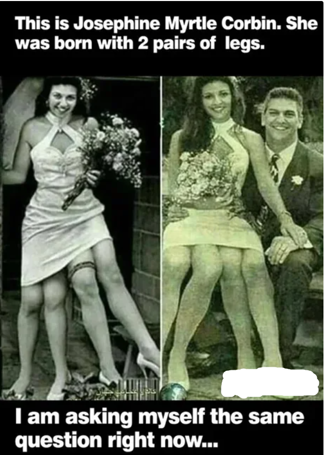 Edit: the length isn’t absurd but this is not a traditional dress, not what I’d expect from a century and a half ago. The way these fake images show four “normal” legs should also be a red flag, there’s no way the four of them could grow to look like typical legs, legs are mostly muscle and that means her body’s biomechanics would seriously restrict their ability to grow to look like typical legs.