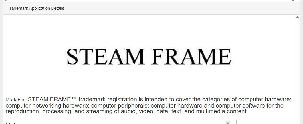 STEAM FRAME™ trademark registration is intended to cover the categories of computer game consoles for recreational game playing; video game consoles; video game accessories, namely, controllers for video games.