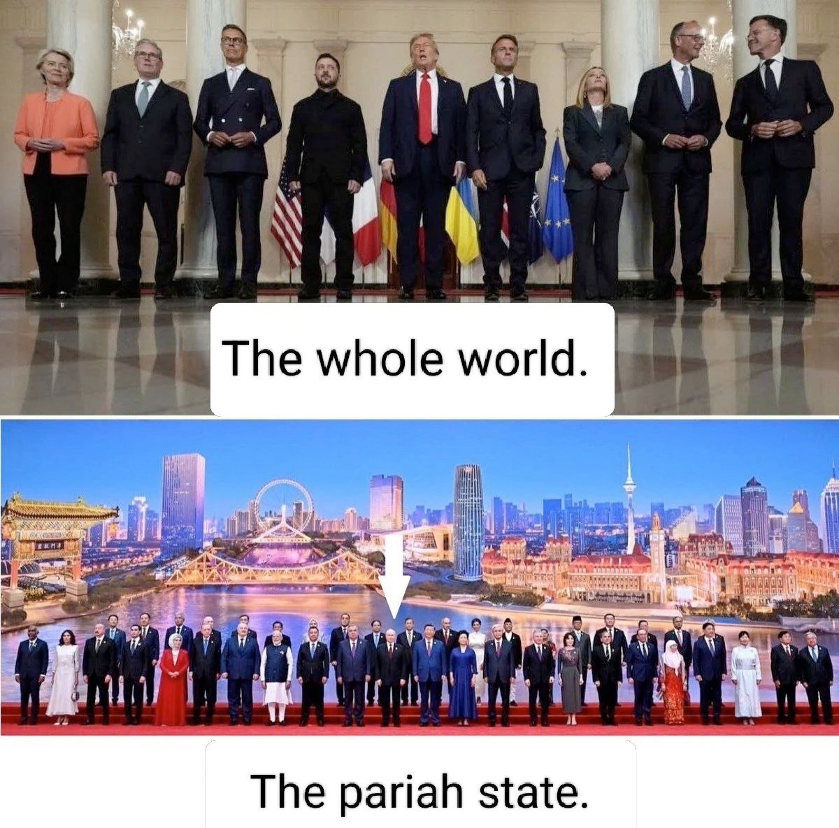 The nefarious Russian hides in a horde of short-stature Asians. The noble Ukrainian stands proud as a peer among his towering anglo protectors