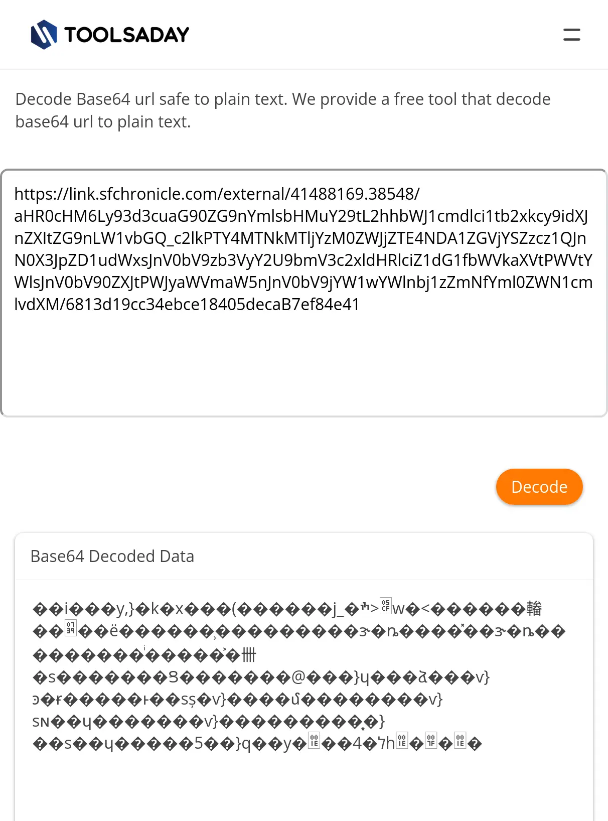 /character isn’t a part of the base64 encoding. In fact, only one part of the URL looks like base64. No plain base64 tool (whether via CLI, self-hosted, or otherwise) will be able to decode an entire URL like that. You’ll first need to parse the URL to isolate the base64 part. This is literally solved with a single line of bash:echo "https://link.sfchronicle.com/external/41488169.38548/aHR0cHM6Ly93d3cuaG90ZG9nYmlsbHMuY29tL2hhbWJ1cmdlci1tb2xkcy9idXJnZXItZG9nLW1vbGQ_c2lkPTY4MTNkMTljYzM0ZWJjZTE4NDA1ZGVjYSZzcz1QJnN0X3JpZD1udWxsJnV0bV9zb3VyY2U9bmV3c2xldHRlciZ1dG1fbWVkaXVtPWVtYWlsJnV0bV90ZXJtPWJyaWVmaW5nJnV0bV9jYW1wYWlnbj1zZmNfYml0ZWN1cmlvdXM/6813d19cc34ebce18405decaB7ef84e41" | cut -d/ -f6 | base64 -dSee TIO for example.
