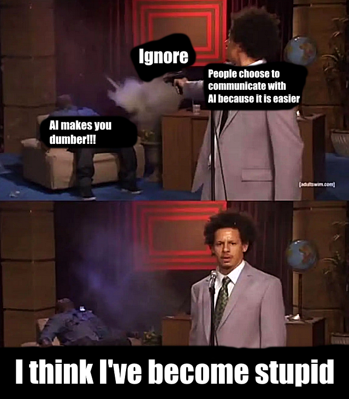 While I understand and generally agree with your sentiment, this meme sucks, sorry. Human beings as a whole are always going to go with the path of least resistance, that making them stupid or not. The issue is ai being shoved down our throat, when its the first thing that shows up, your gonna use it.