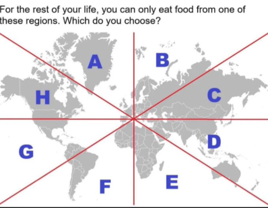 Yeah it too hard a problem. Like what about fusion places? I guess if we’re talking about only being able to eat in one region I guess we have to admit NYC is OP with so many different immigrants from around the world you’ll be able to find anything there. I can’t tell if NYC is in H or G but that’s one to pick.