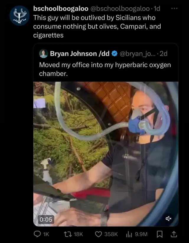 Our bodies have multiple enzymes and antioxidants to keep oxygen from slowly killing us. And this guy wants to concentrate it. Hyperbaric has its uses, making a normal person live longer is not one of them.