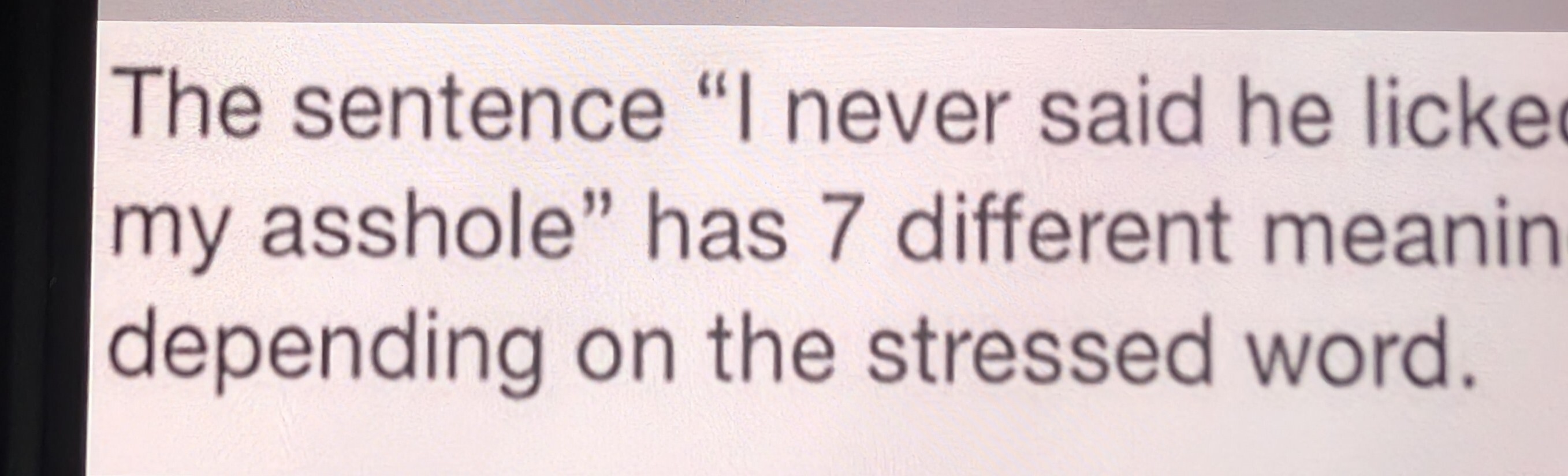The sentence “I never said he licked my asshole” has 7 different meanings depending on the stressed word.