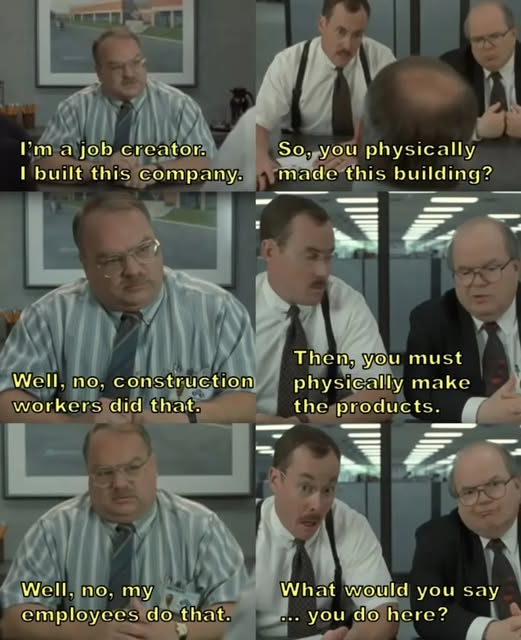 managers and executives are workes too, and noone is saying they do no work. But their value is greatly inflated. Aswell as them taking all the credit for work of others.