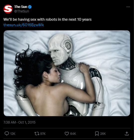 The STDs caught from robosex are gonna be gnar. Some kid in another country’ll upload a virus that hijacks your dick. Gonna need a trojan to protect against trojans.