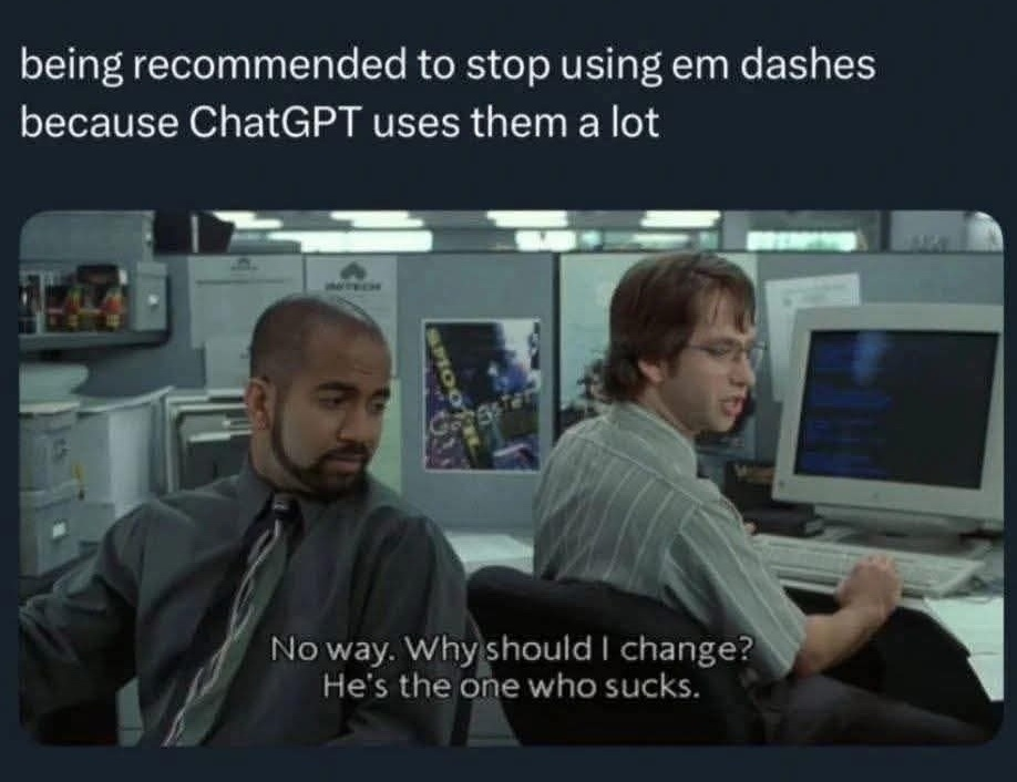 I have no idea why chatgpt got so obsessed with em dashes when the vast majority of online discourse uses a hyphen in its place