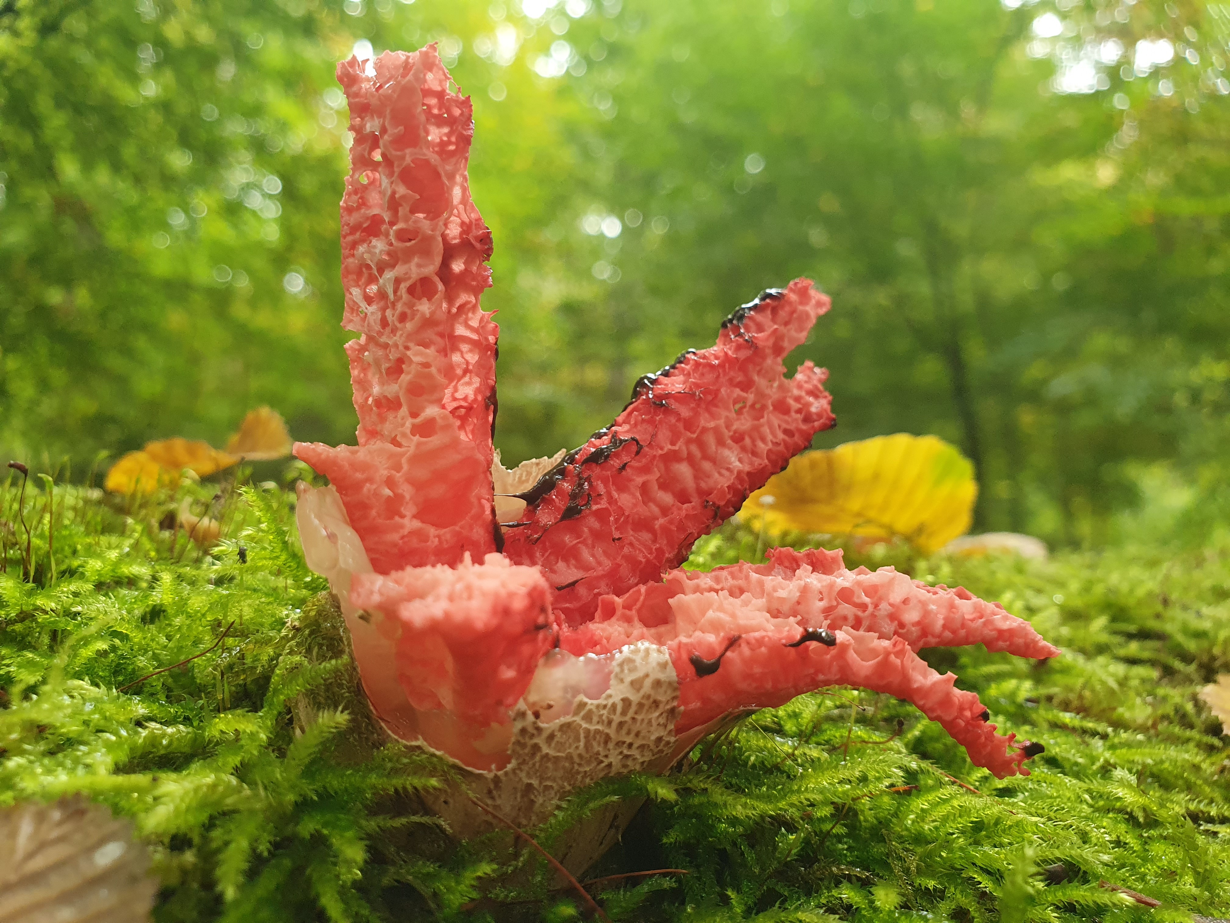 🐙—today’s ultimate find, an “octopus stinkhorn” or “devil’s fingers”, i.e., fungus “Clathrus archeri (synonyms Lysurus archeri, Anthurus archeri, Pseudocolus archeri)”. This fungus’ smell is absolutely horrid.