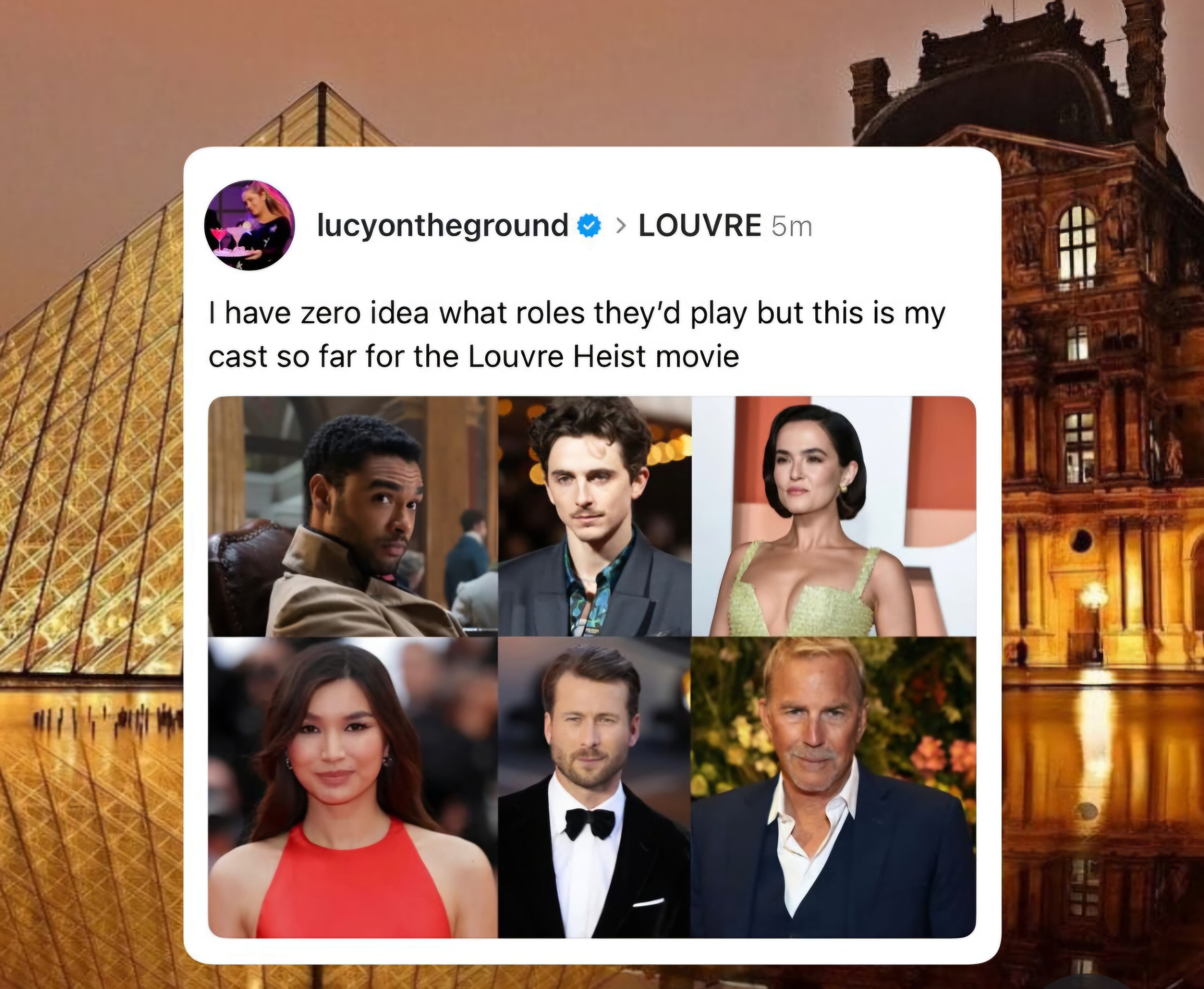 Kinda random group, but I think it’s Rege Jean-page, timothee chalamet, Zoey deutch, Gemma Chan, glen powell and Kevin Costner.