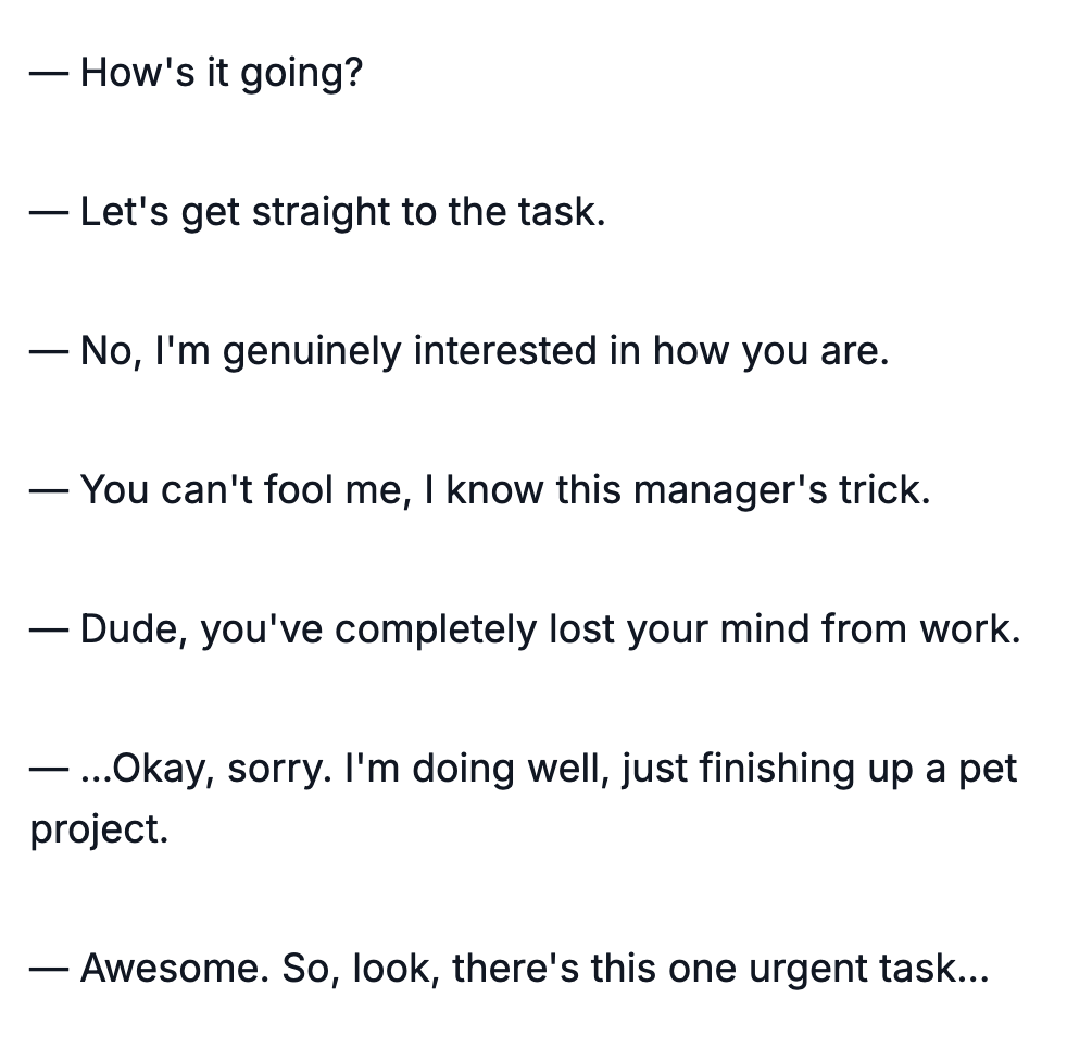 minus-squareNotMushroomForDebate@lemmygrad.mllinkfedilinkEnglisharrow-up2·edit-21 month agoIs this still the case? I thought this was slowly falling out of style, but maybe it depends on the place. More and more in my experience it goes something like: “How’s it going?” “It’s going” “Yeaaah…”