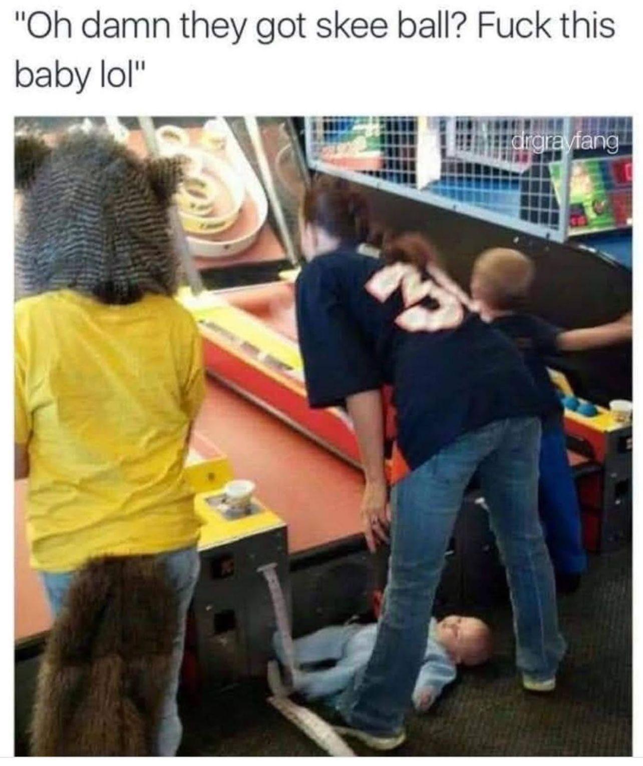 The baby is on their back. Their face is pointing up. It doesn’t seem to be old enough to crawl away, so I don’t think there’s a danger of the baby rubbing their face on the floor. The mom stepping on it, kicking it, or dropping an errant skeeball on it accidentally seems plausible.
