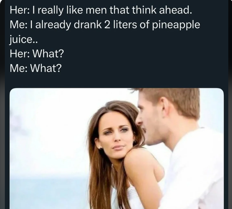 minus-squareSynapse@lemmy.worldlinkfedilinkarrow-up4·11 days agoIt’s believed that drinking pineapple juice will make a man’s sperm taste better.