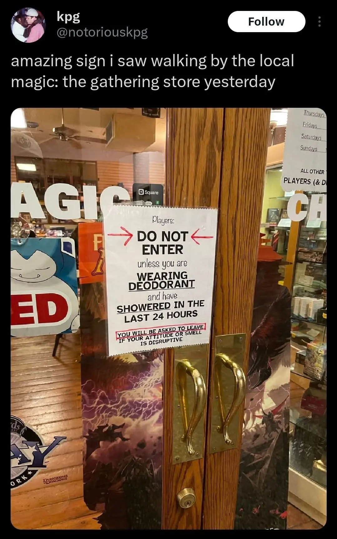 I’m sure plenty of people do, maybe you’re even one of them, but turning this into blanket statements is weird and annoying. How many people think, because of the culture embodied in this sign, that they must shower every day, and never even check?