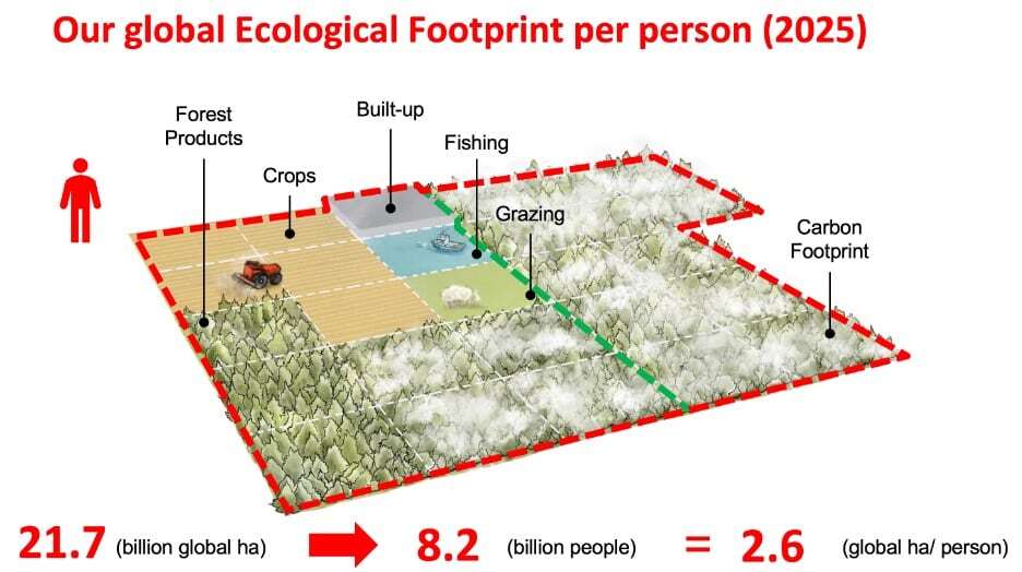 The Ecological Footprint metric shows how much nature we use compared to how much nature we have.