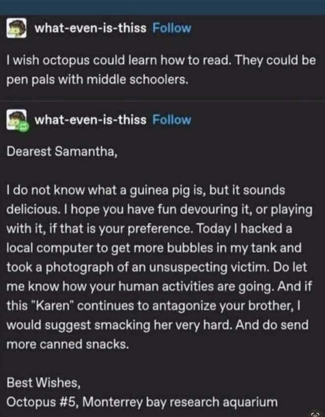 Two Tumblr posts by what-even-is-thiss. The first post reads “I wish octopus could learn how to read. They could be pen pals with middle schoolers.“ The second post reads “Dearest Samantha, I do not know what a guinea pig is, but it sounds delicious. I hope you have fun devouring it, or playing with it, if that is your preference. Today I hacked a local computer to get more bubbles in my tank and took a photograph of an unsuspecting victim. Do let me know how your human activities are going. And if this “Karen” continues to antagonize your brother, l would suggest smacking her very hard. And do send more canned snacks. Best Wishes, Octopus #5, Monterrey bay research aquarium.”