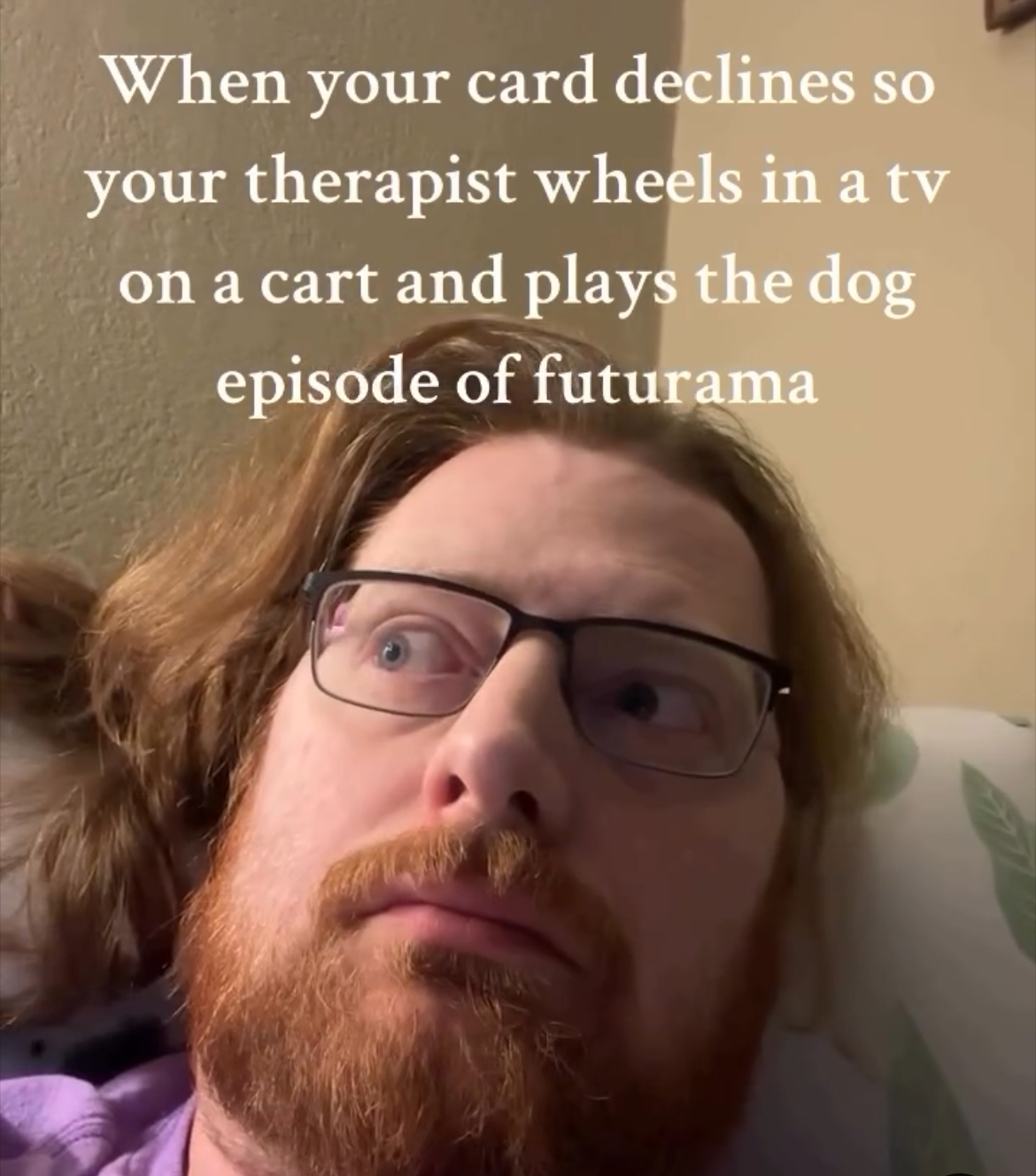 A picture of a man with long red hair laying down and looking to the side with mild terror. The caption reads “When your card declines so your therapist wheels in a tv on a cart and plays the dog episode of futurama.”