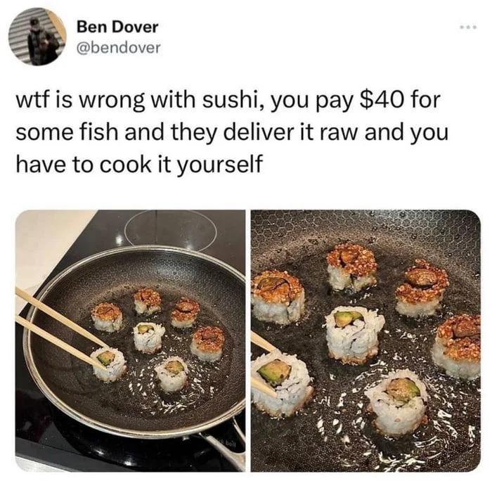 SSUPII@sopuli.xyz to Lemmy Shitpost@lemmy.world · 2 days agosushi deliverysopuli.xyzimagemessage-square104fedilinkarrow-up1862arrow-down116