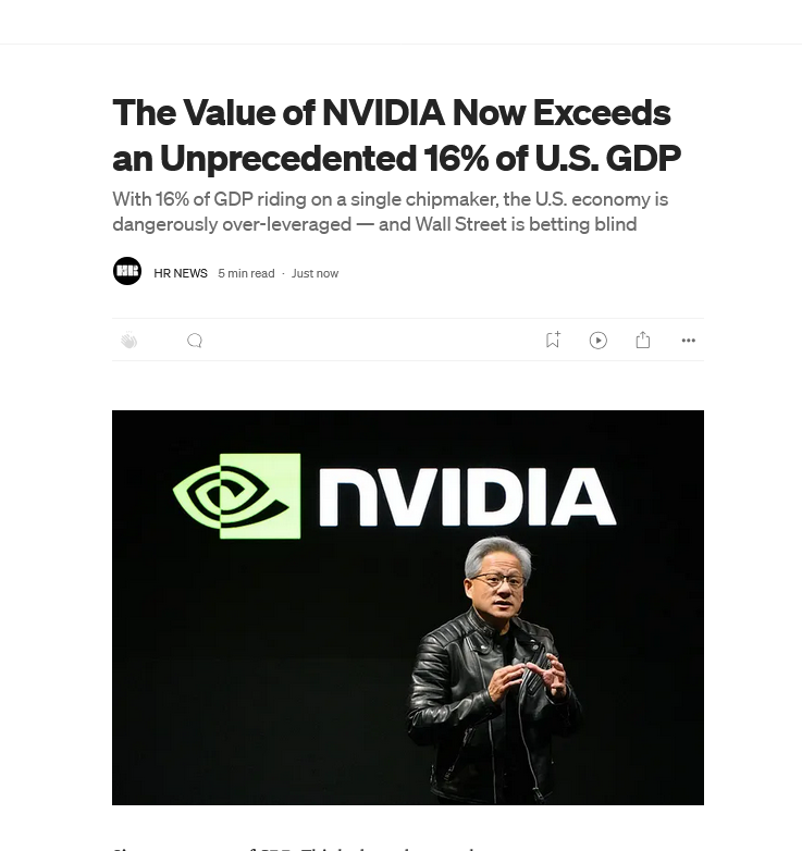 https://medium.com/@hrnews1/the-value-of-nvidia-now-exceeds-an-unprecedented-16-of-u-s-gdp-ede4b541b24c Sixteen percent of GDP. Think about that number.