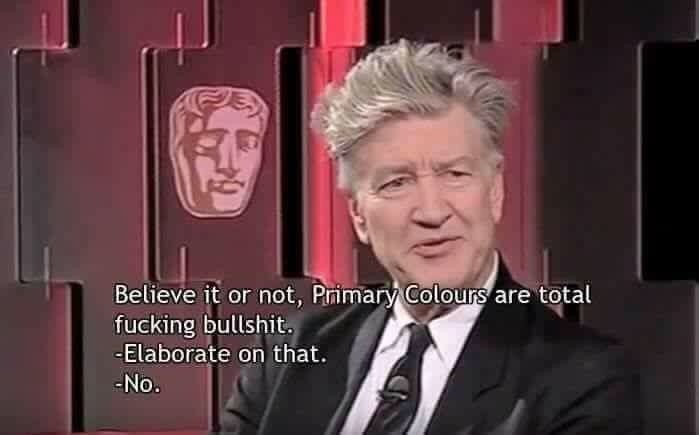 A lot of formulaic stuff in media is bullshit. So much shit is done for no other reason than because it worked once before. Primary colors are one of them. Story structure; forget the actual name of it but every story doesn’t need to be arranged in that particular order of start, build up, conflict, resolution (Pulp Fiction is a great example of something that ignores this rule). And more.