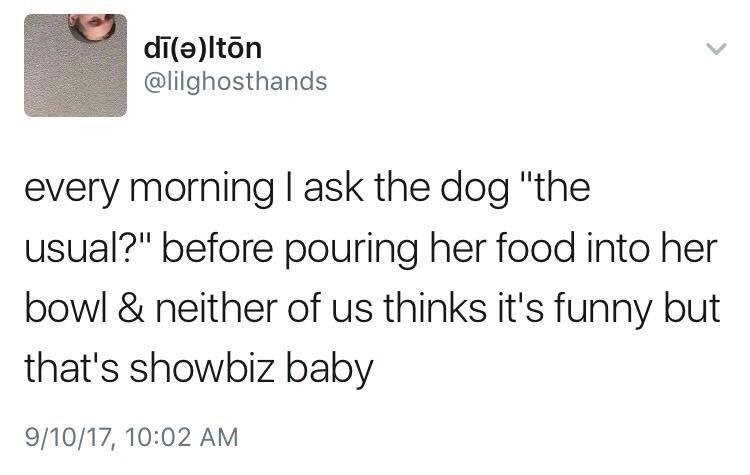 When I pour my dog’s food I tell her ‘yes! This is super rich and tasty food for very small, and very good, and very beautiful doggies! D’ya see? It says it right here (it doesn’t, actually, it only says it’s for small dogs but she can’t read), see? There’s even a picture! But this doggy isn’t as good, or as beautiful, or as small as my wee girl is, is it?’ And then I have to pet her, kiss her on the fore head, and point to her plate and say ‘come on! Do eat it!’ Or she just would keep staring at me like waiting.