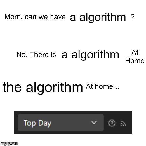 newand upvote all the quality stuff so the reast of us can usetop dayImgur users on ‘new’ once ran an experiment for a day where they upvoted basically anything — in practice, oddest and weirdest stuff bubbled up. I’ve never seen such entertaining feed before or after.