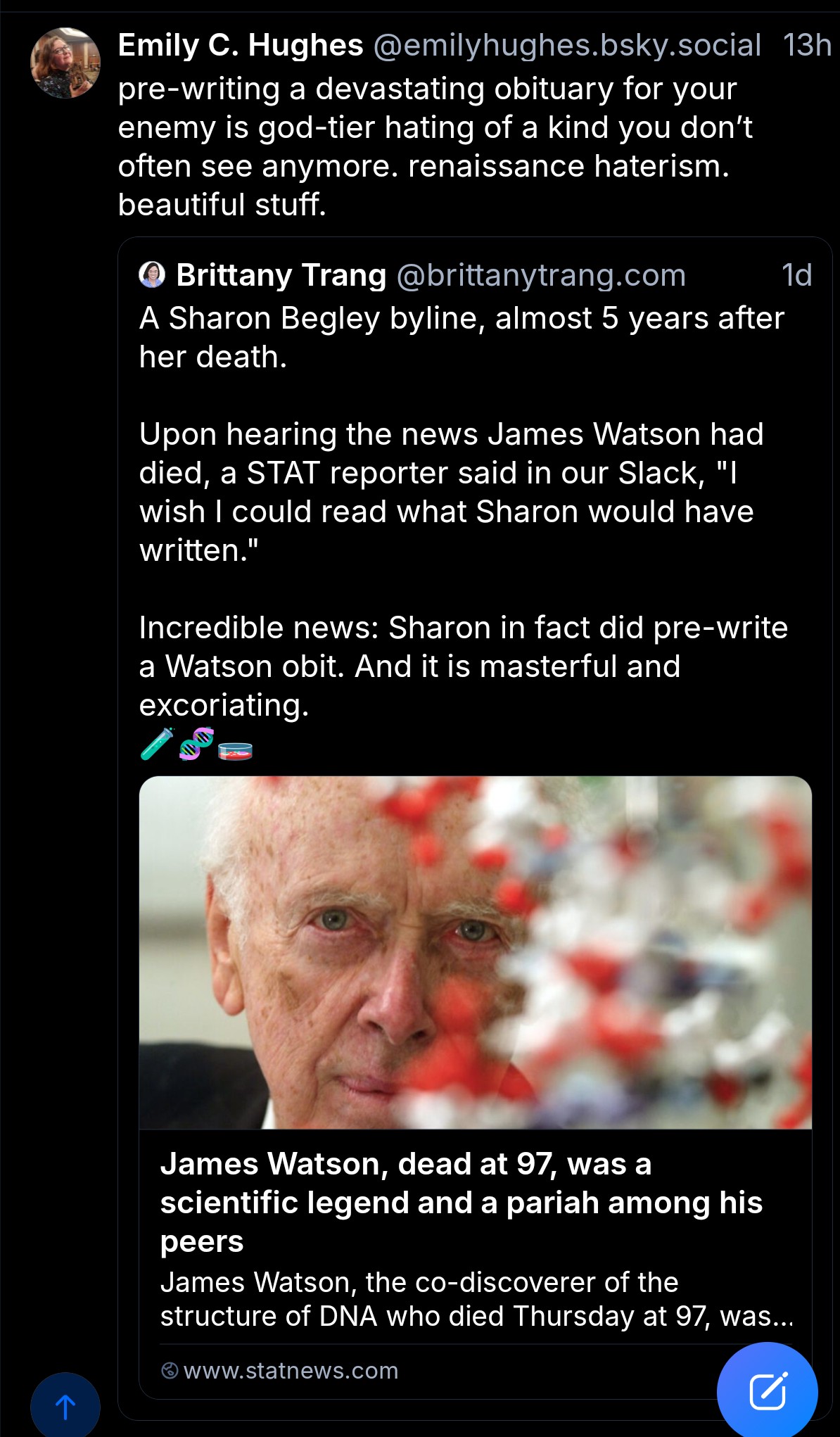 Sharon Begley wrote “James Watson, dead at 97…” ? if not, where is her writing?