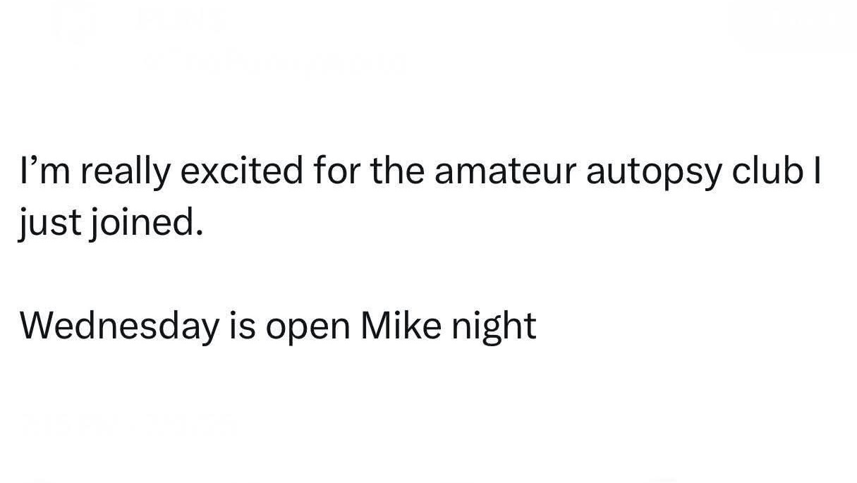 Black text on white background that reads “I’m really excited for the amateur autopsy club I just joined. Wednesday is open Mike night.”