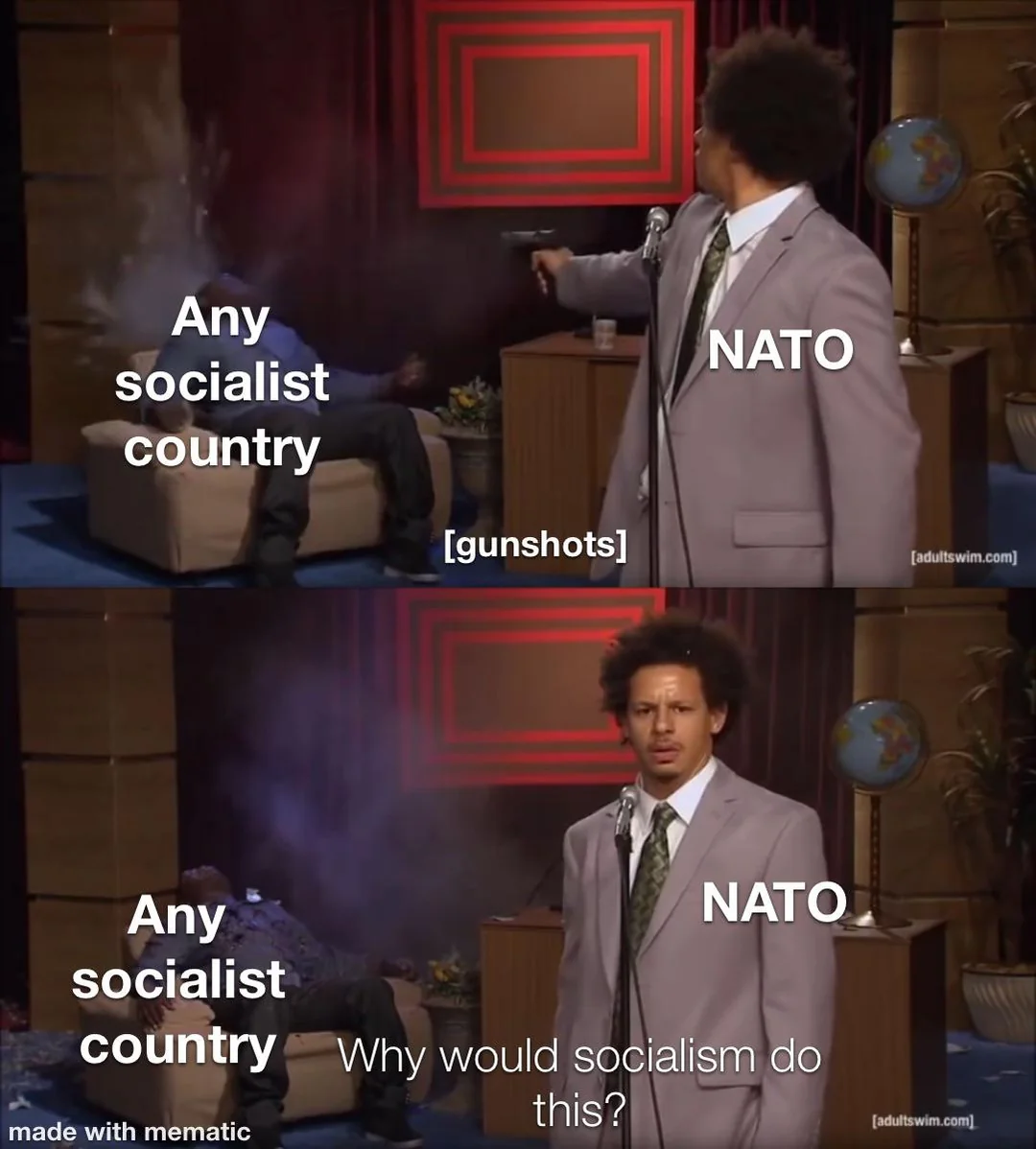 arrow-up118arrow-down1imageNATO, the totally "defense" organization!lemmy.mlbubblybubbles@lemmy.ml to shitposting@lemmy.ml · 24 days agomessage-square1fedilink