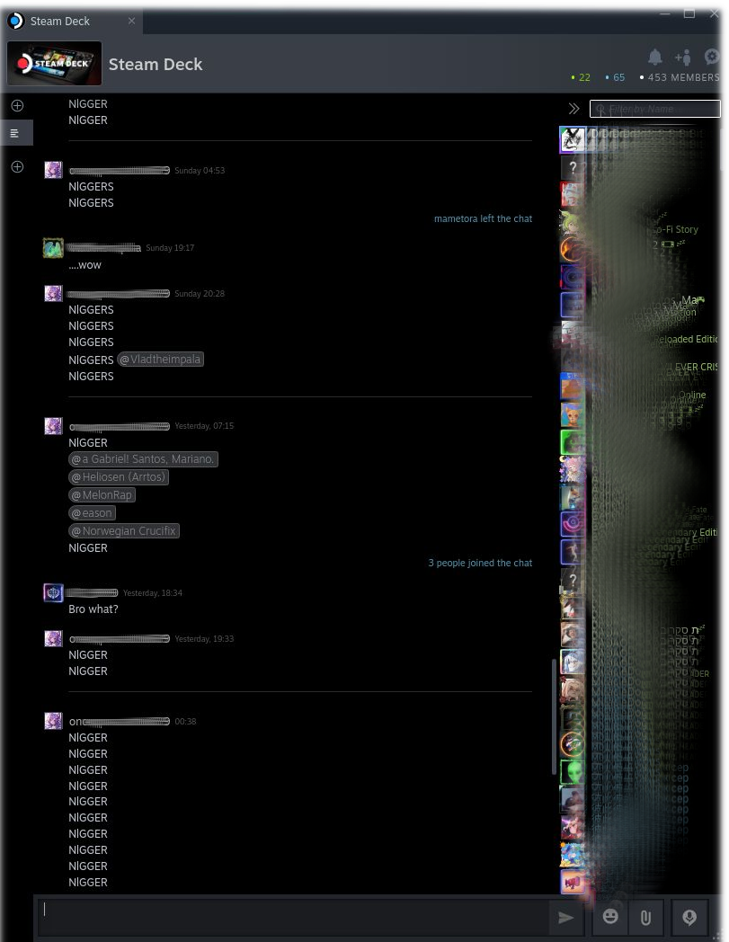 A ban might eventually happen, but that misses the point. This started on Friday last week, it’s been five days of this. Relying on a slow, reactive ban system after a racist spammer has already poisoned a chat for nearly a week is the failure.