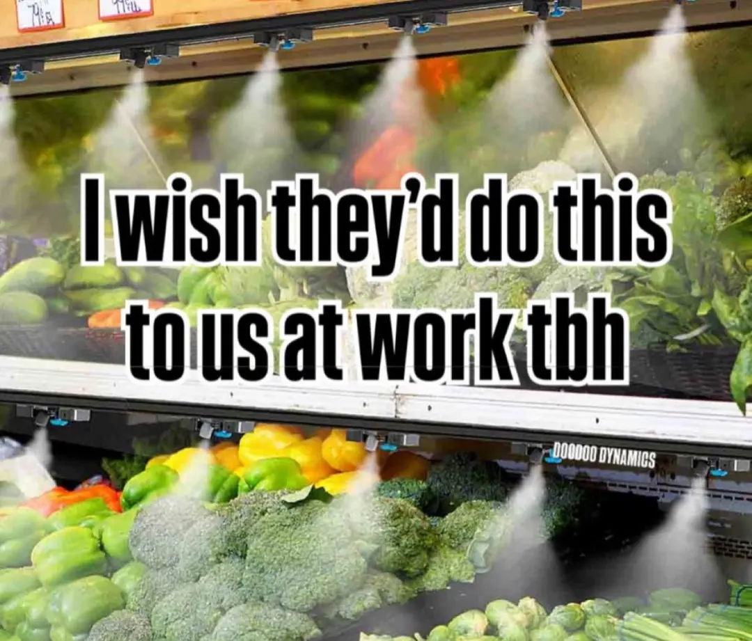They could do this without causing rot. Spray the water into the airflow of the display rather than directly onto the produce, and also by covering the produce on display when they’re closed.