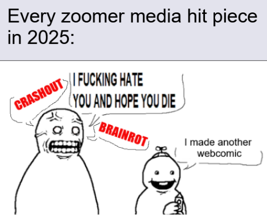 I do want to specify that I am not counting AI in what I am talking about. I agree AI is worse and I consider it a whole different beast than the regular brainrot any generation consumes. I love shitposts, I love stupid and surreal memes, I love the stupid cringey internet shit like Homestuck, or Skibidi Toilet, whatever. Even if I don’t actually interact with it, I love that it exists and that people are enjoying it. Its real, its human, and like it or not it is art.