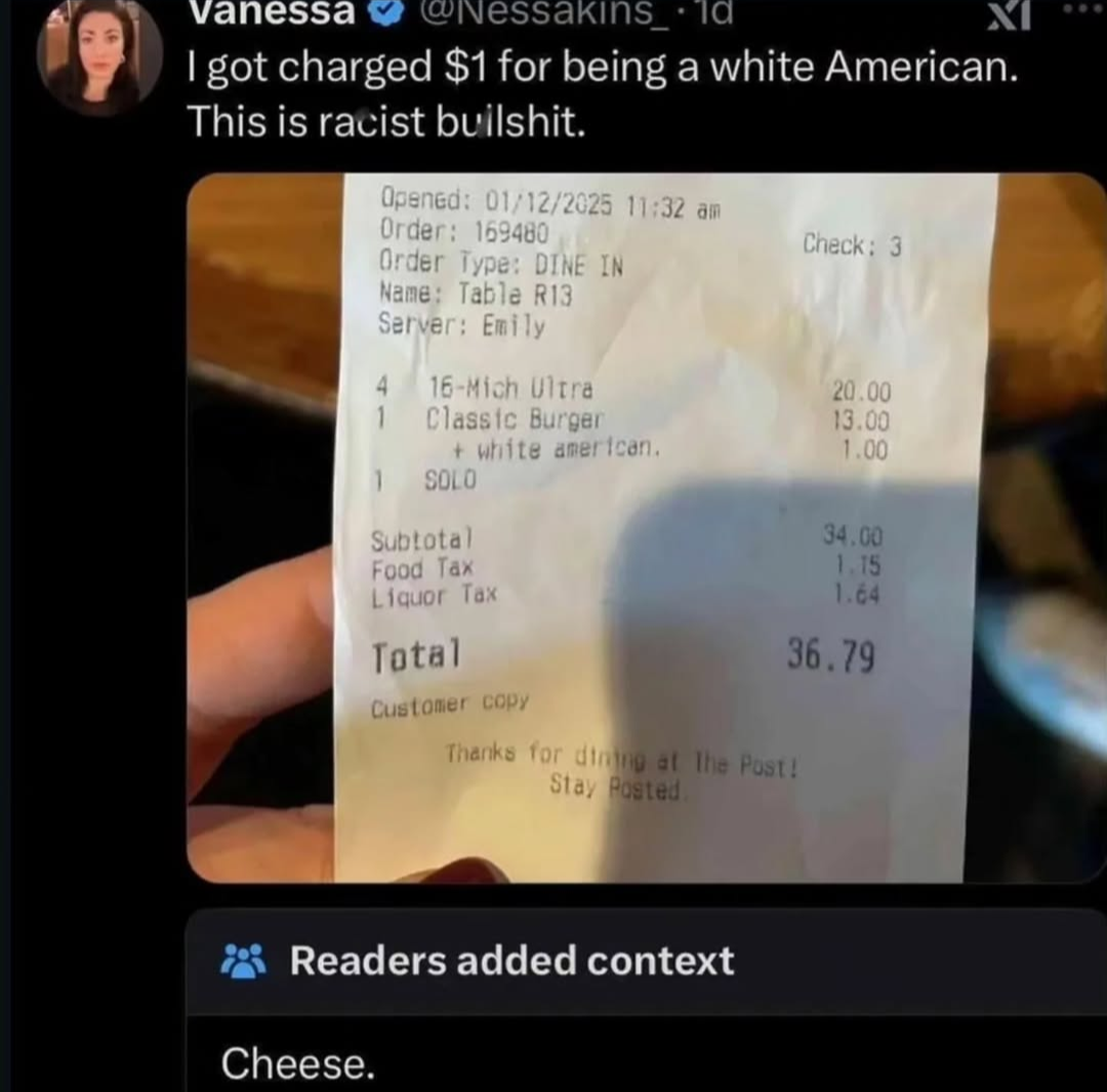 no banana@piefed.world to Lemmy Shitpost@lemmy.worldEnglish · 1 day agoRacism restaurant media.piefed.worldimagemessage-square123fedilinkarrow-up1998arrow-down117
