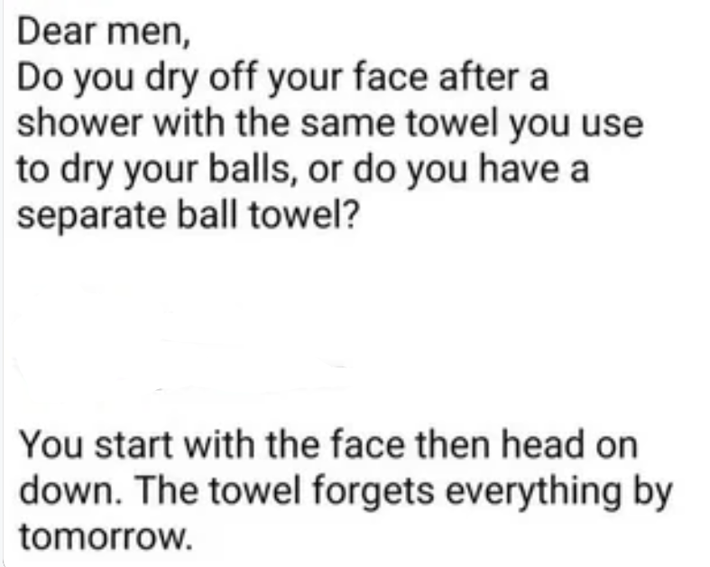 I have always used the same towel for everything but I do realize now that I pick the towel off the rack and place it over my head the same way, making it so my head gets dried with the “top” of the towel legs with the bottom, and it gets put back on the rod the same direction. So it is possible the ball section of the towel never touches my face, that said… I wouldnt be worried about it anyways. I’m not exactly scared of balls, and they aren’t naturally acidic and even a vaginas acidity (~tomato) level, isn’t dangerous for our skin.