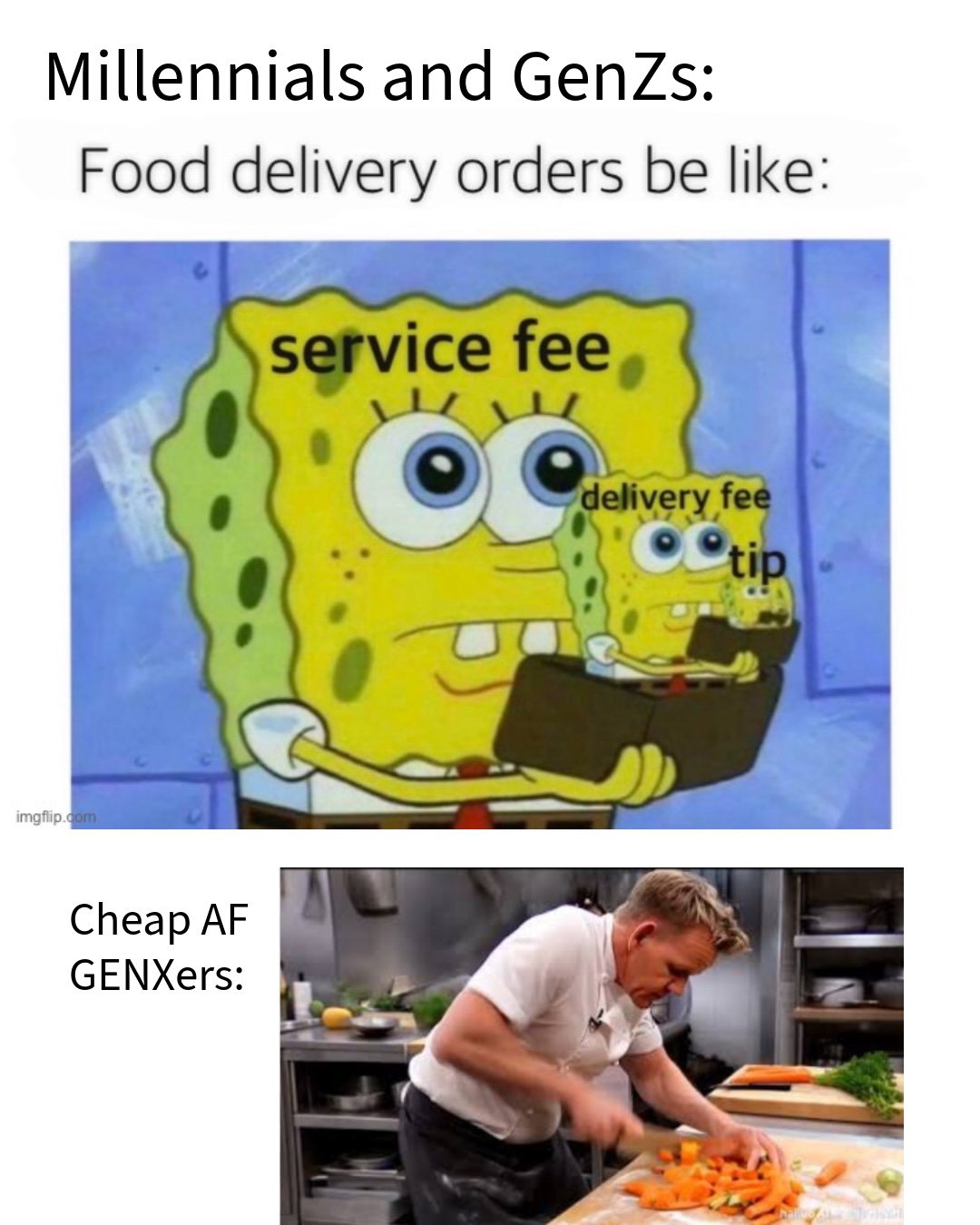 Seeing GenX blow money on deliveries while all the millenials I know are anti-Delivery