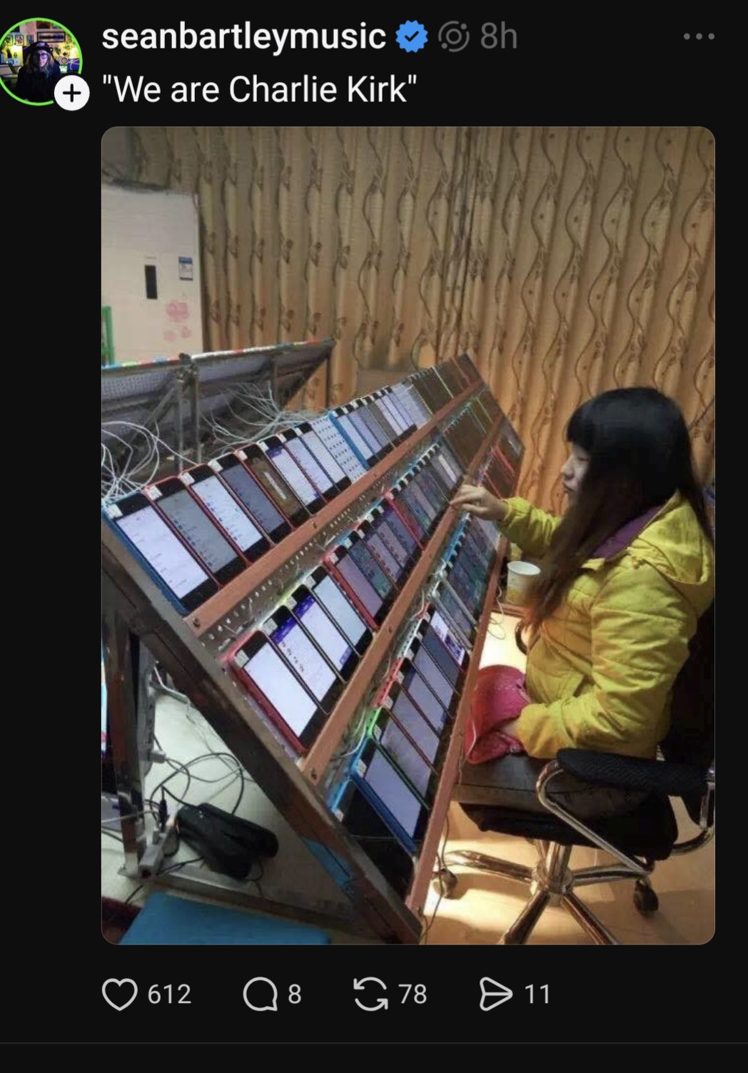Yes. Just one little Japanese girl with 100 iPads tweeting “we are Charlie Kirk” over and over.