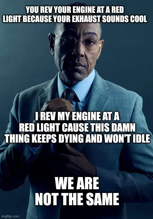 Assuming you have already done normal maintenance (and this meme is based on any form of reality), the first thing I would check is the air intake at the throttle. It gums up at the opening and not enough air can get through at idle.
