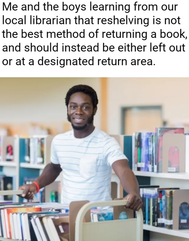 capybeby@sh.itjust.works to Lemmy Shitpost@lemmy.world · 3 days agoLibraries are coolsh.itjust.worksimagemessage-square112fedilinkarrow-up1822arrow-down113
