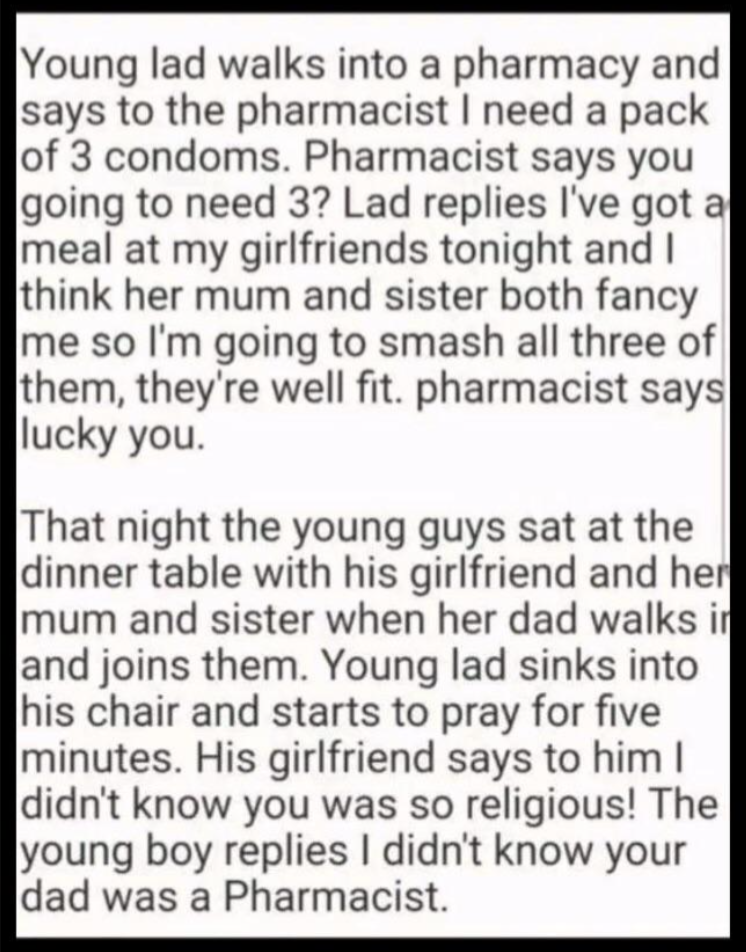 Unless the kid was planning on a single spoot per partner, he would need more than 3 condoms. Pharmacist should have warned him smh, lost business opportunity.