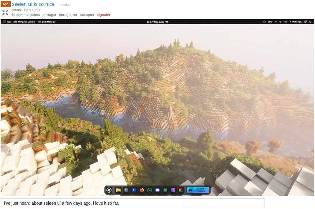 Screenshot of a Reddit post about Seelen UI, a desktop environment with a top bar and a bottom dock. The top bar has an app indicator on the left, the date and time in the middle, and system indicators on the right. The dock contains the Start button, pinned apps, and a small multimedia player.
